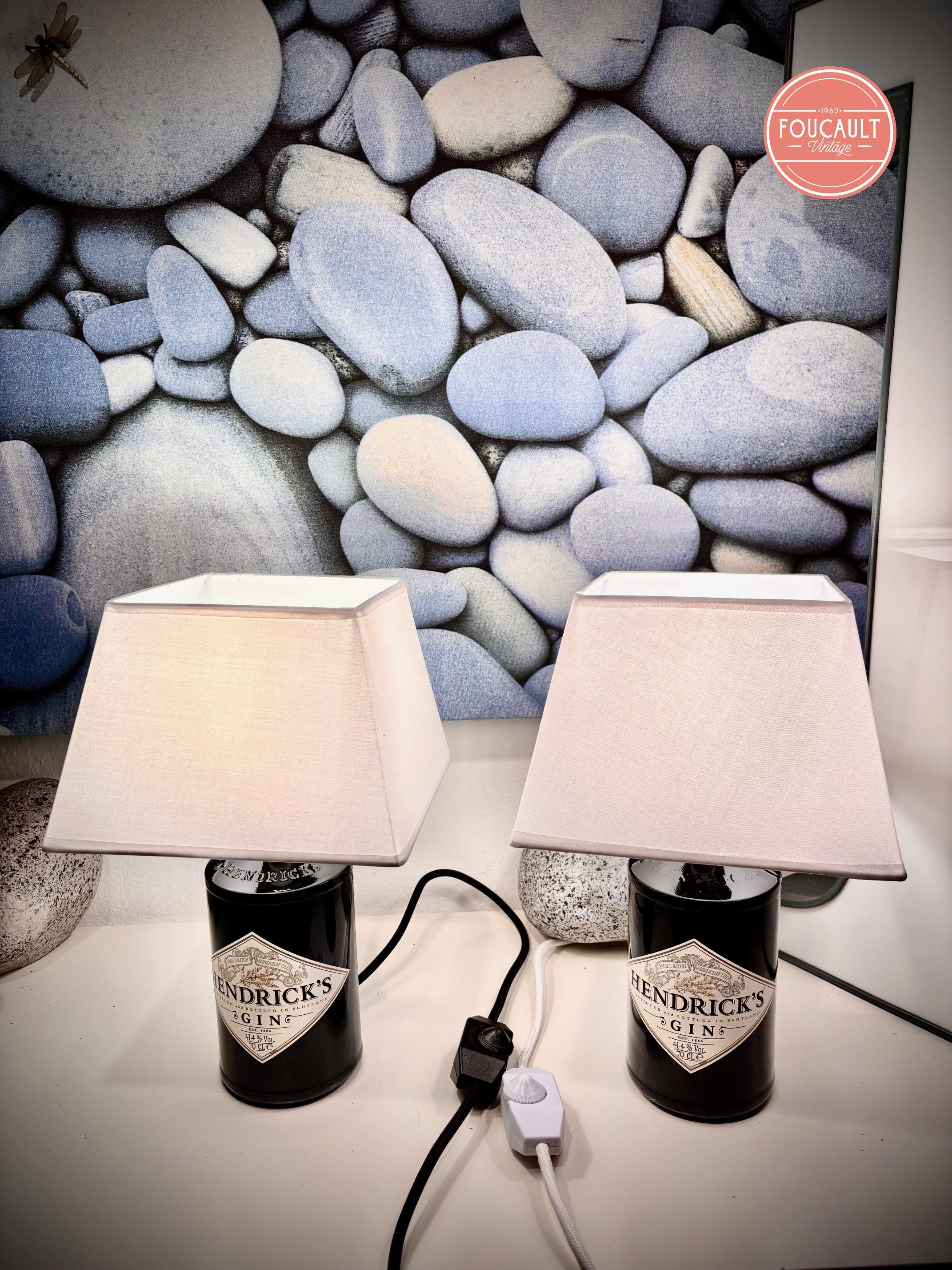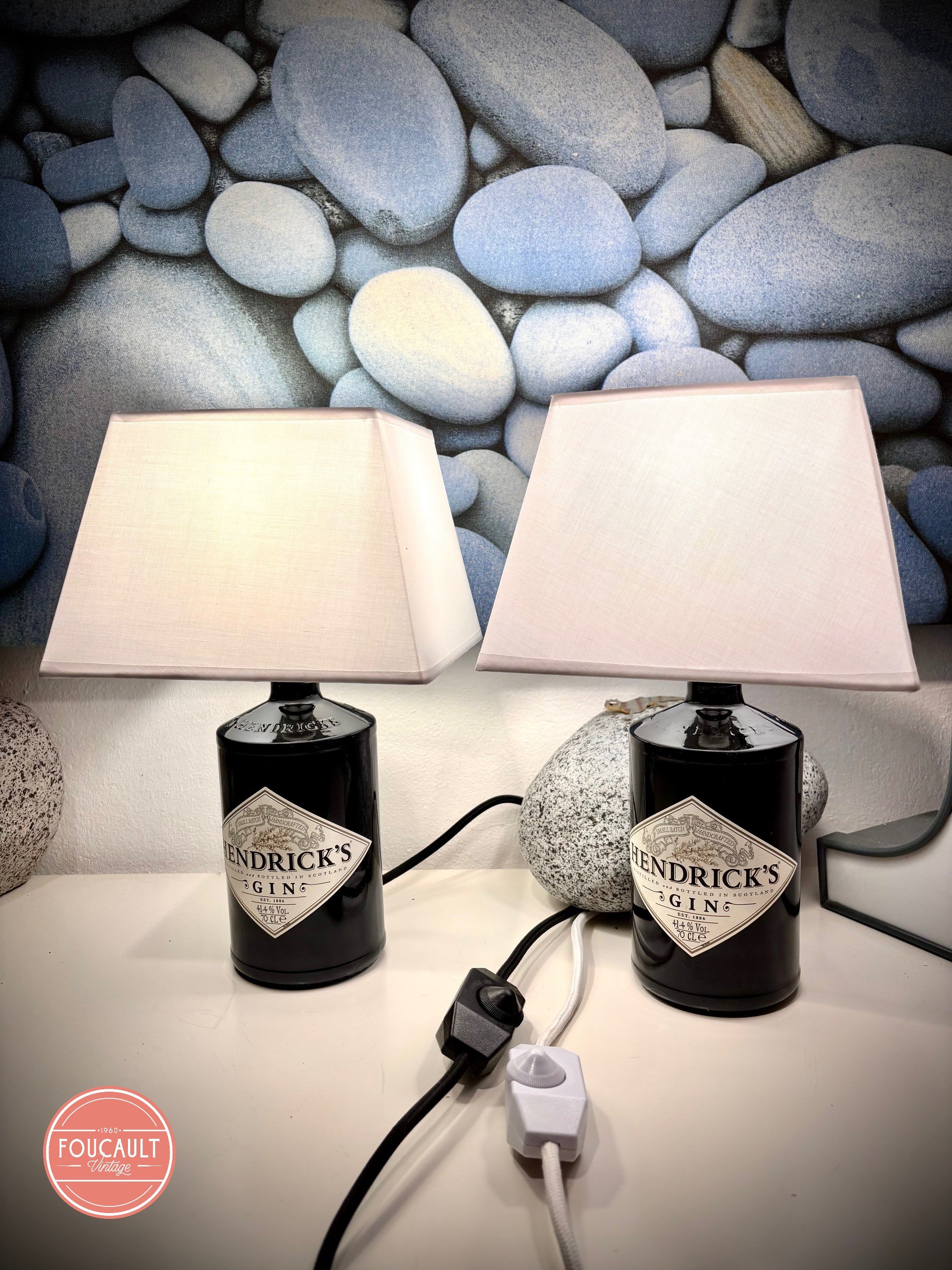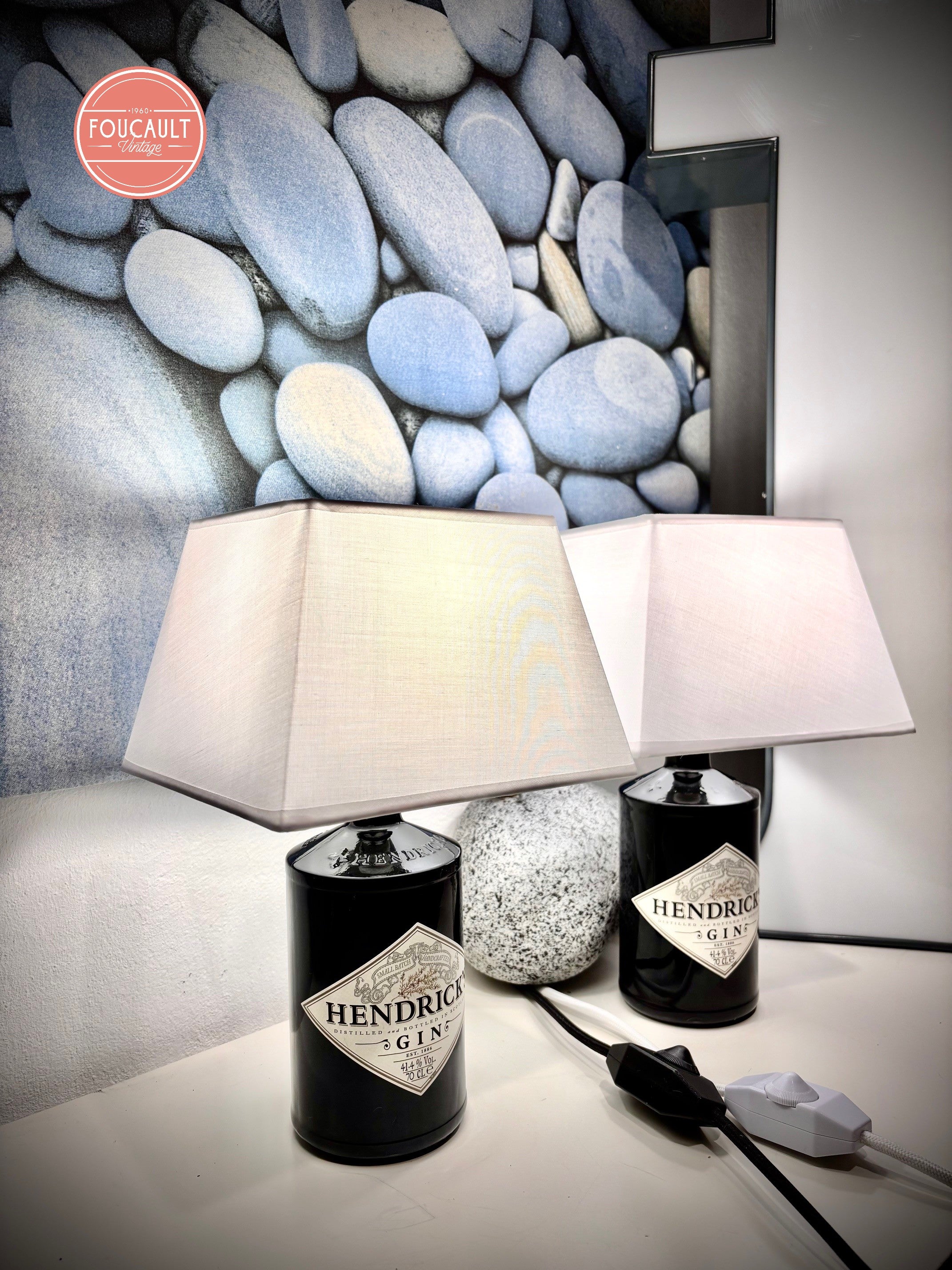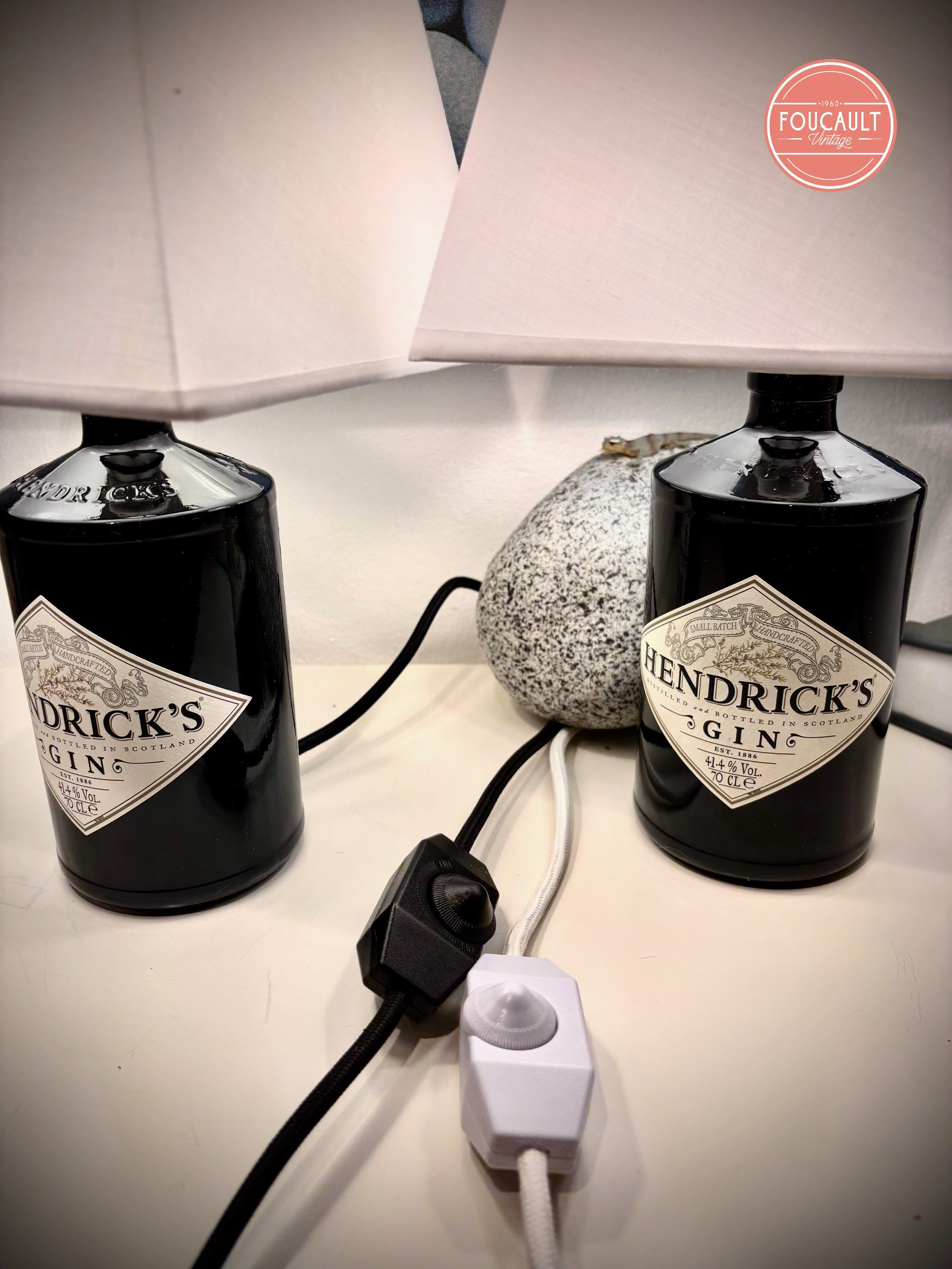 Die Gin-Flaschen haben ein weisses und ein schwarzes Stoffkabel inkl. Dimmer und zwei weisse quadratische Lampenschirme.