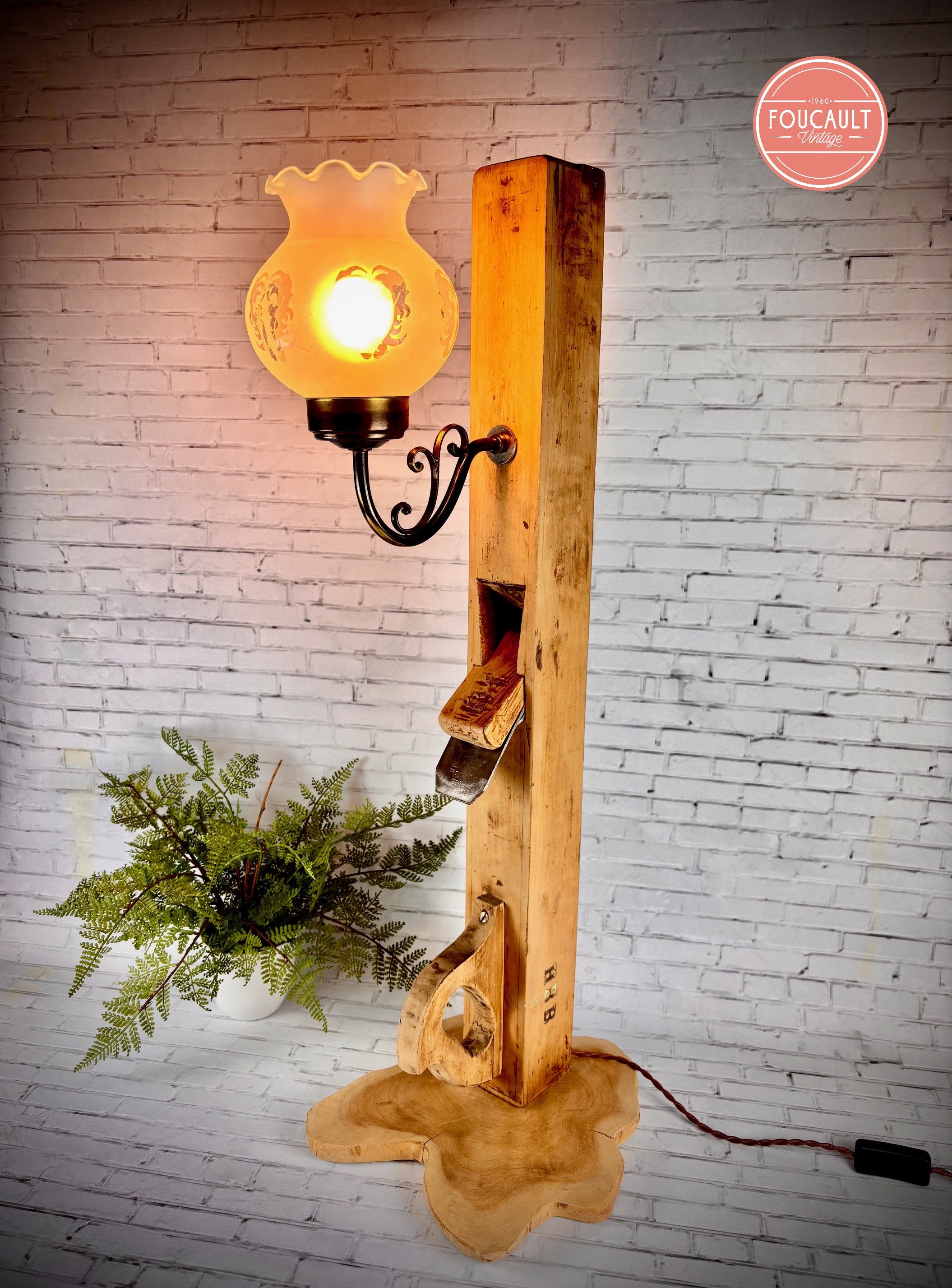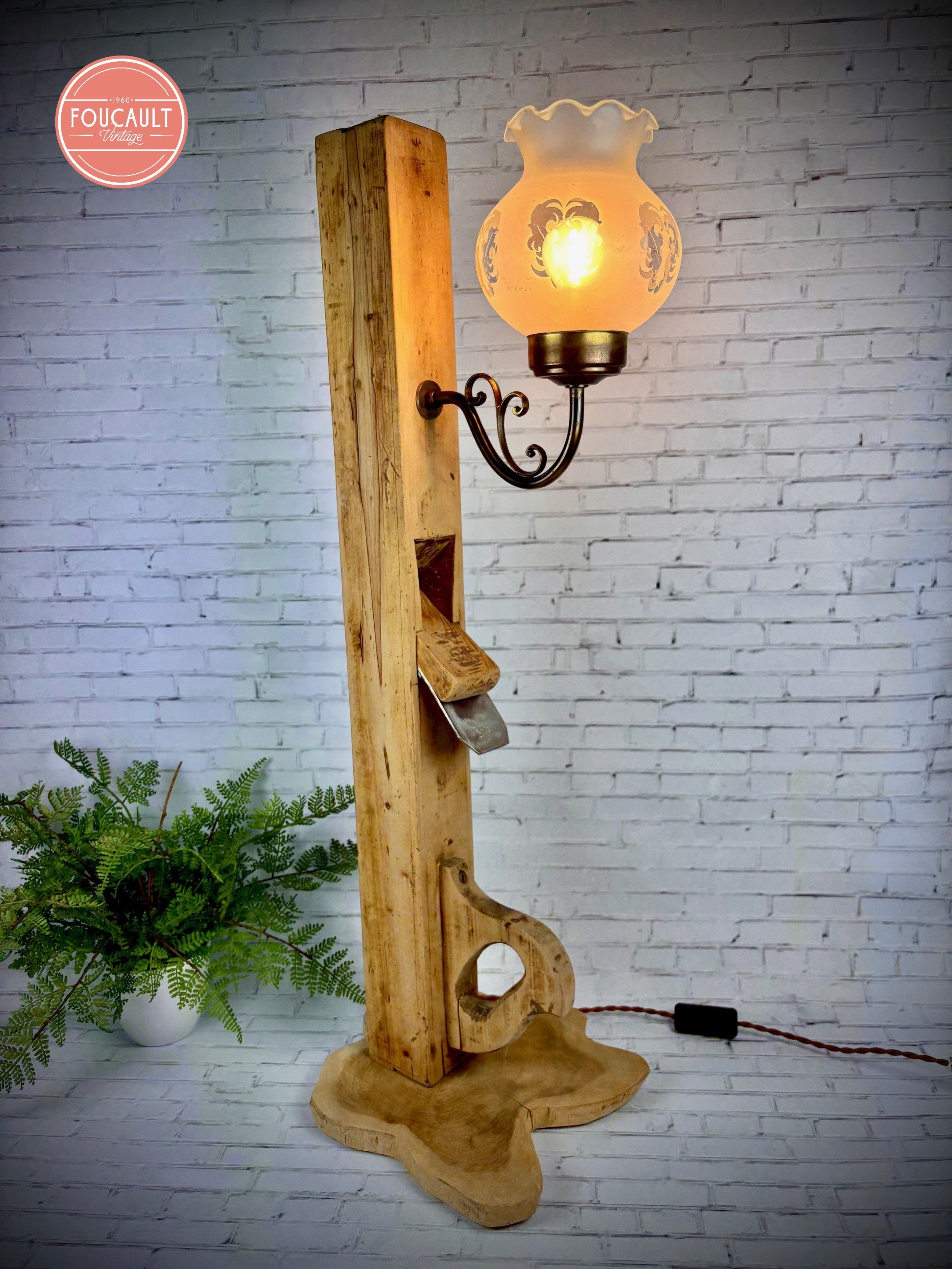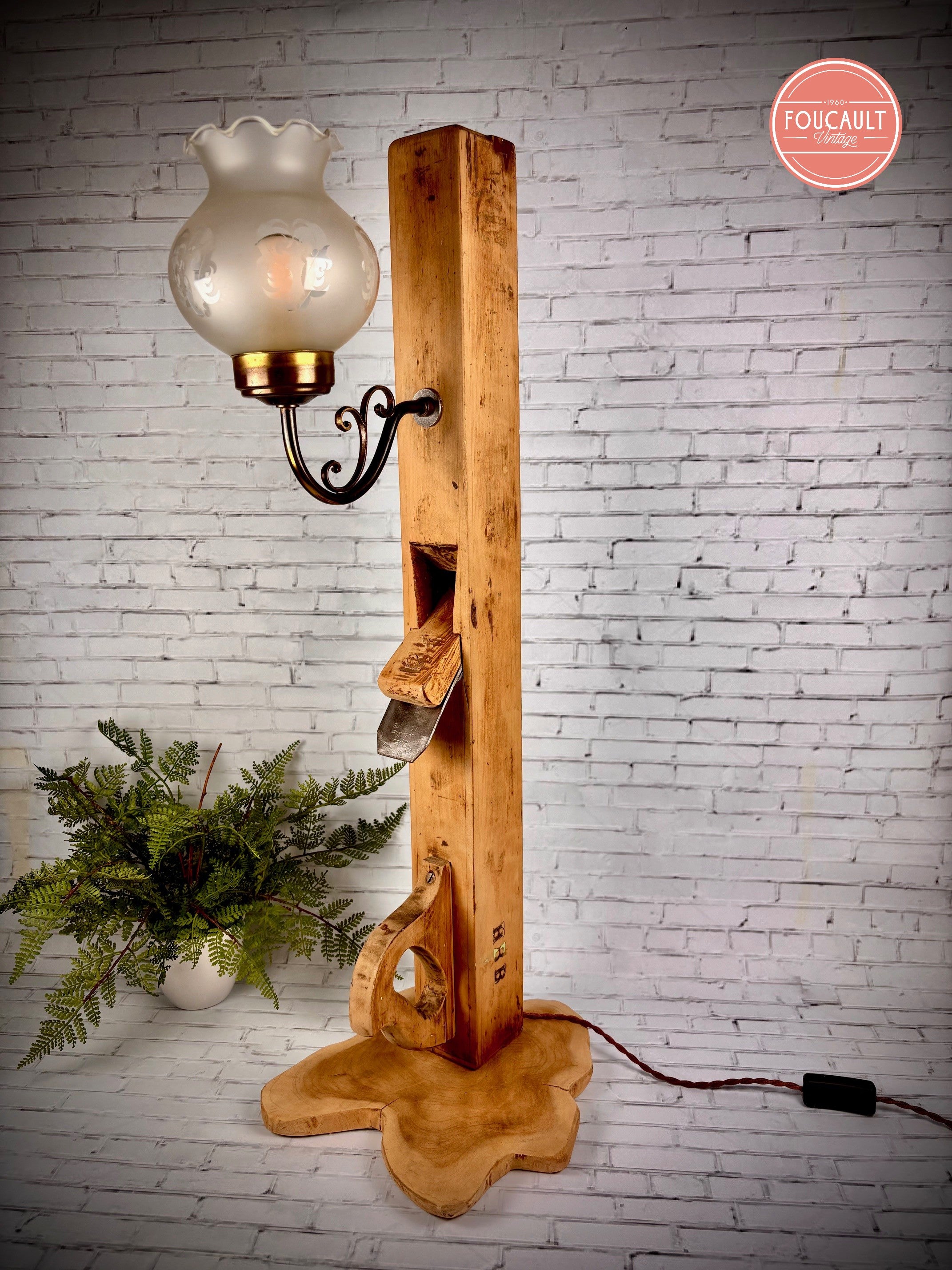 Langhobel mit Messing Glaslampe auf Wurzelholz