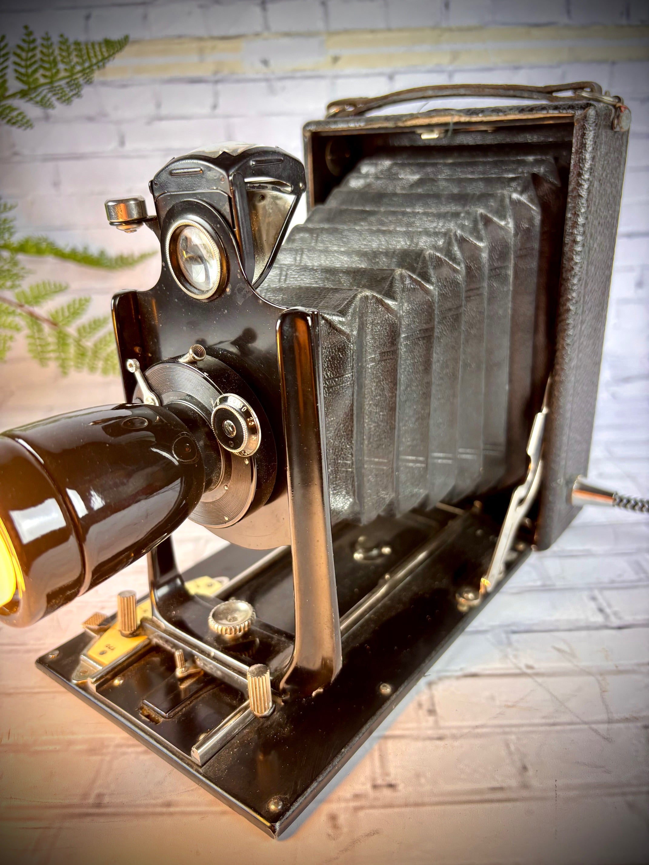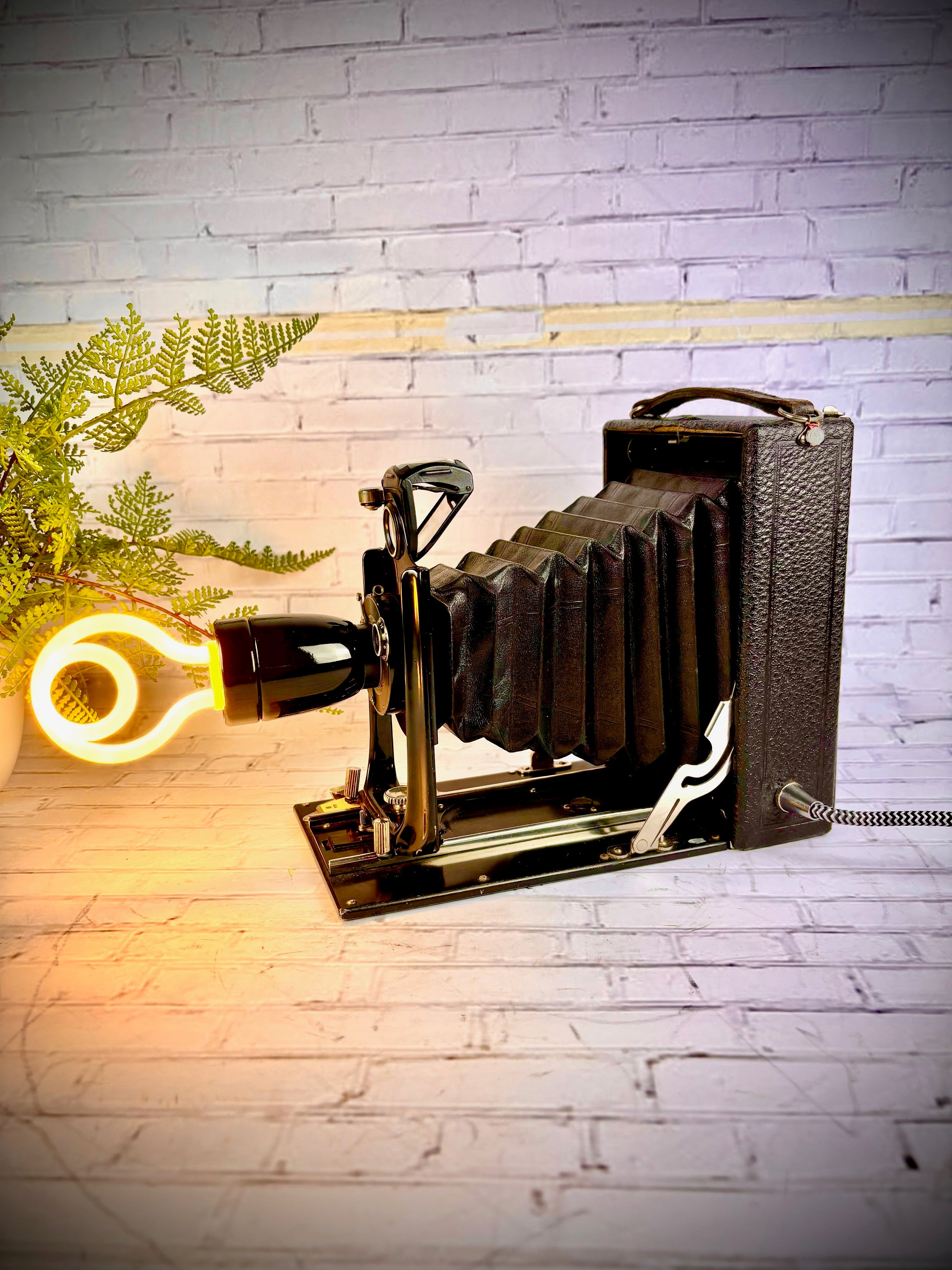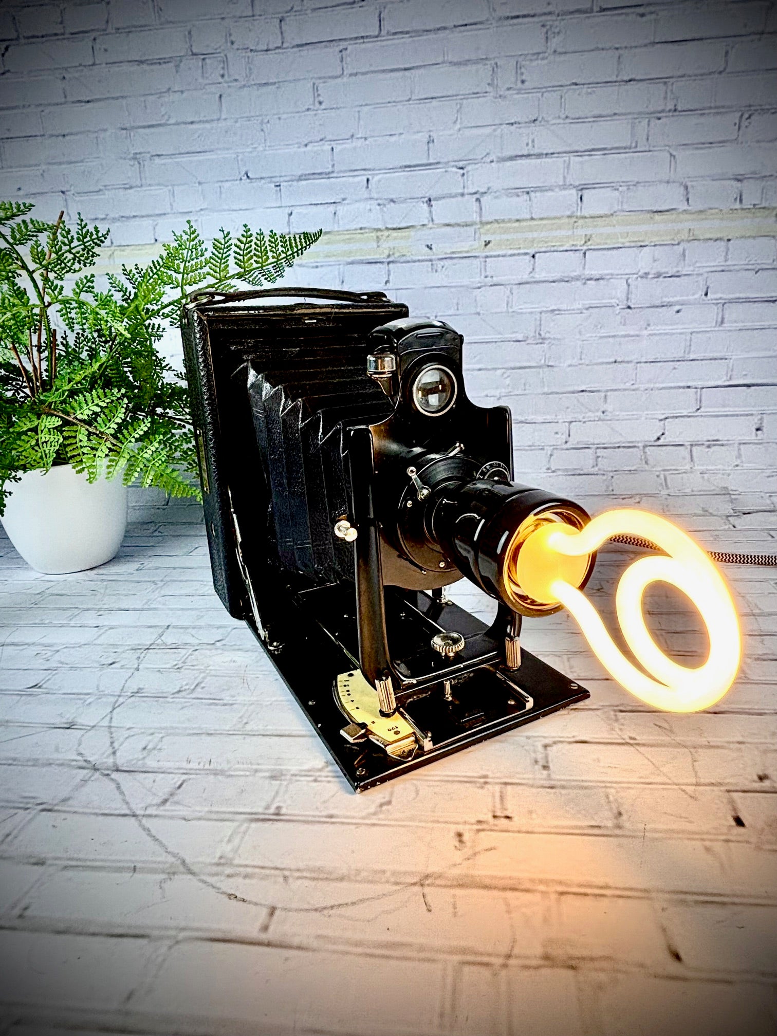 Alte, lange Balgenkamera der Marke «VOLTA». Die Lampe hat beim eingezogenen Stoffkabel einen Kippschalter und ist mit einer Vintage-Glühbirne ausgestattet.