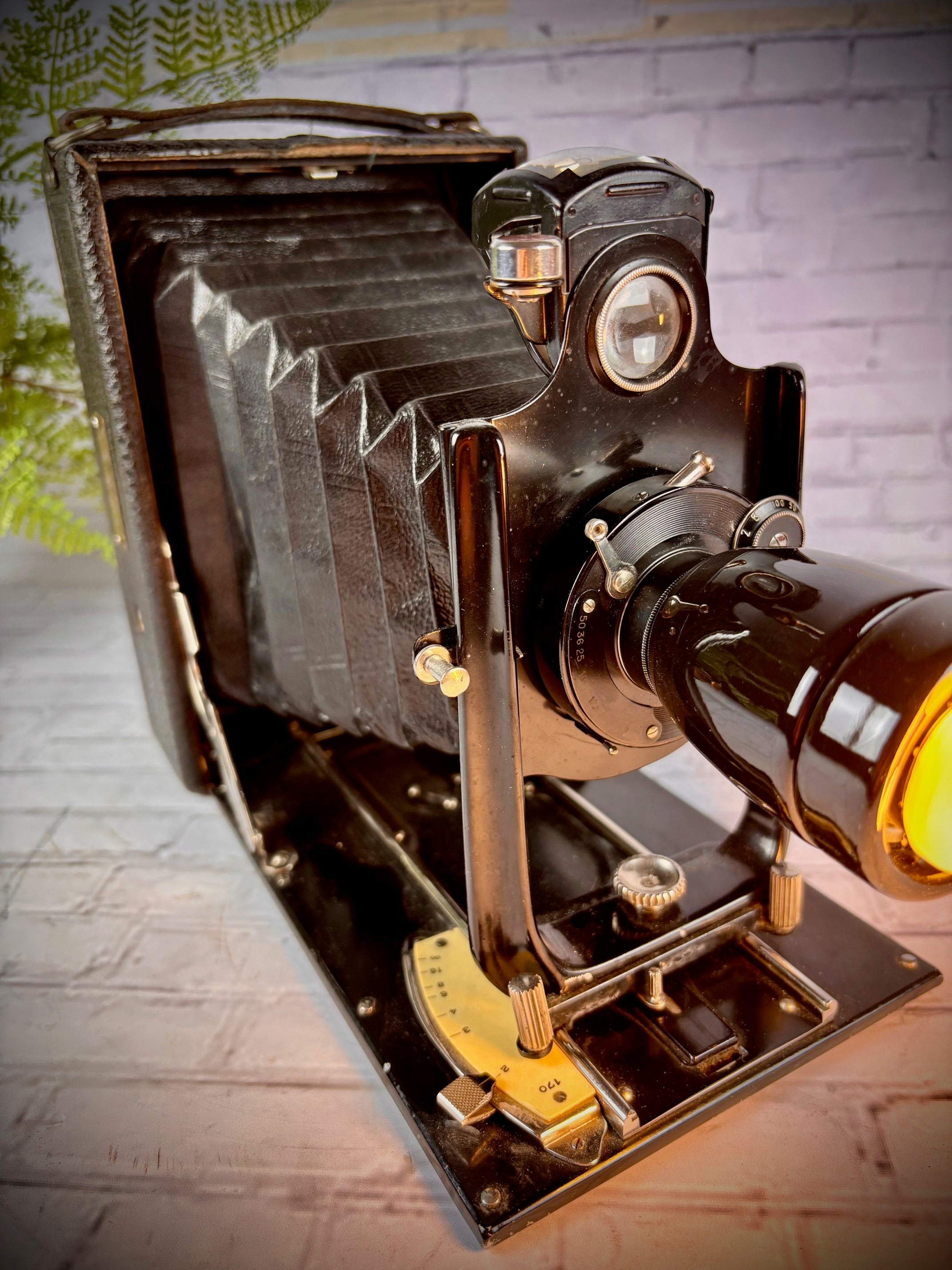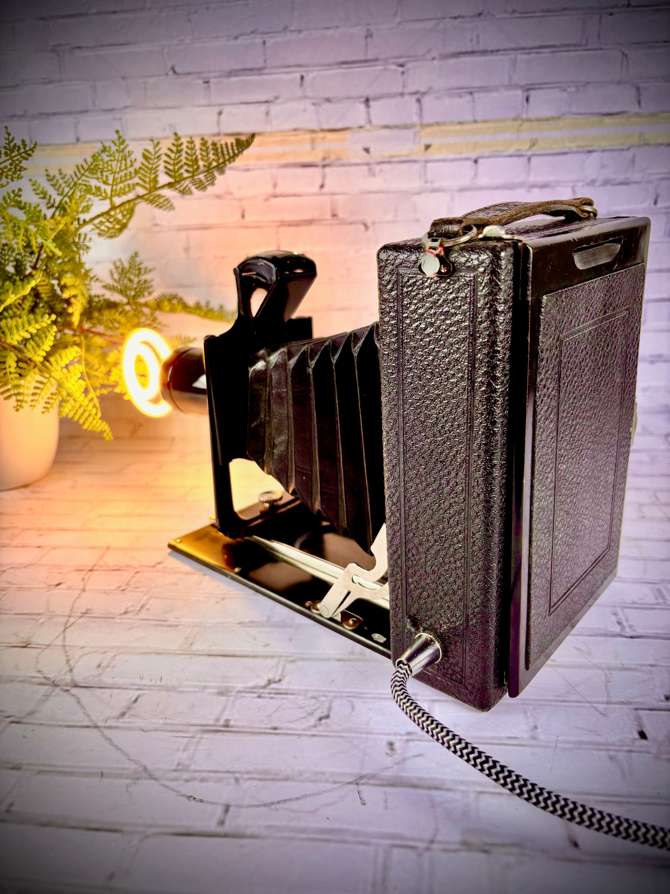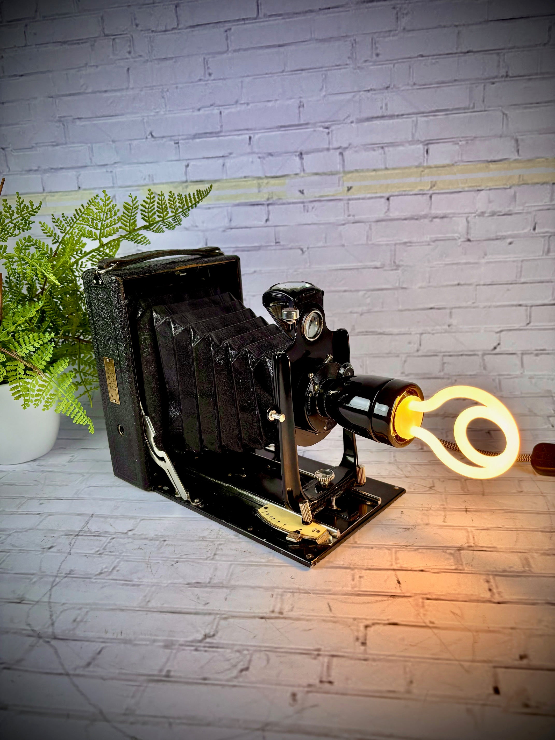 Alte, lange Balgenkamera der Marke «VOLTA». Die Lampe hat beim eingezogenen Stoffkabel einen Kippschalter und ist mit einer Vintage-Glühbirne ausgestattet.