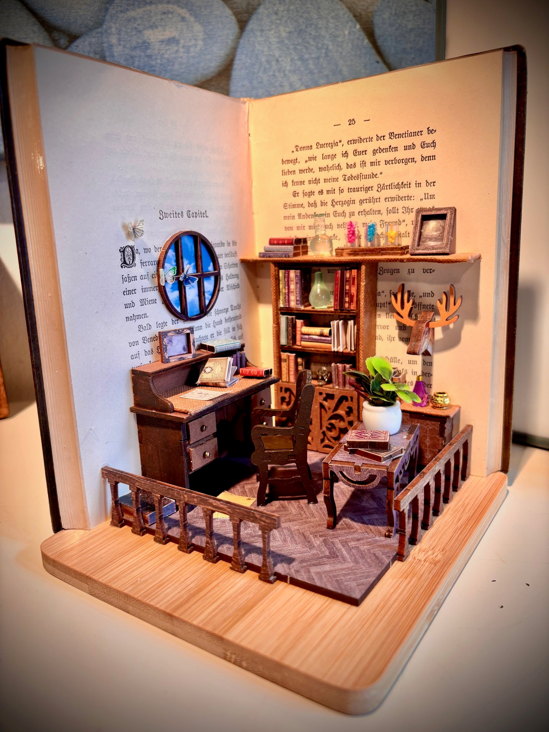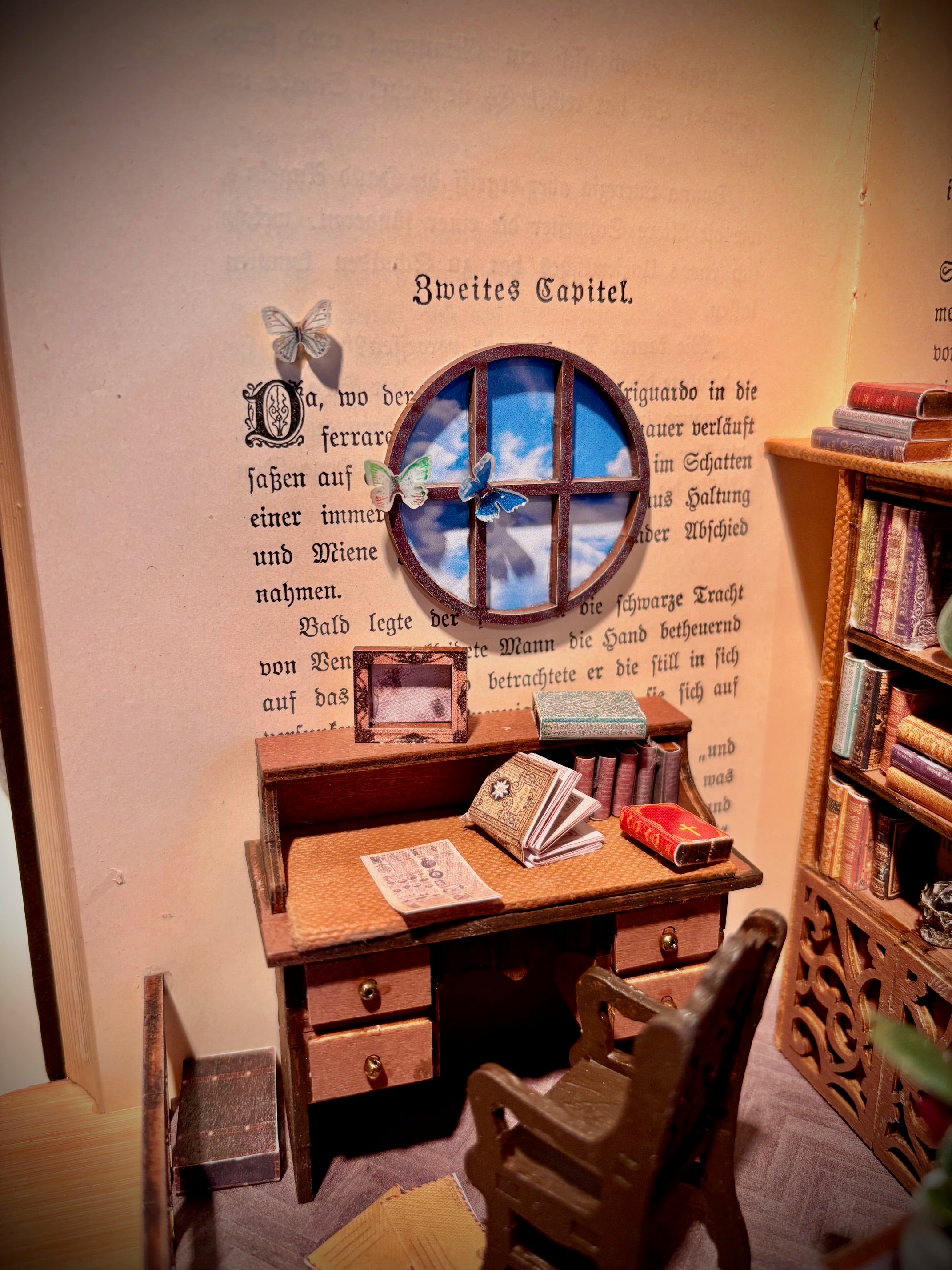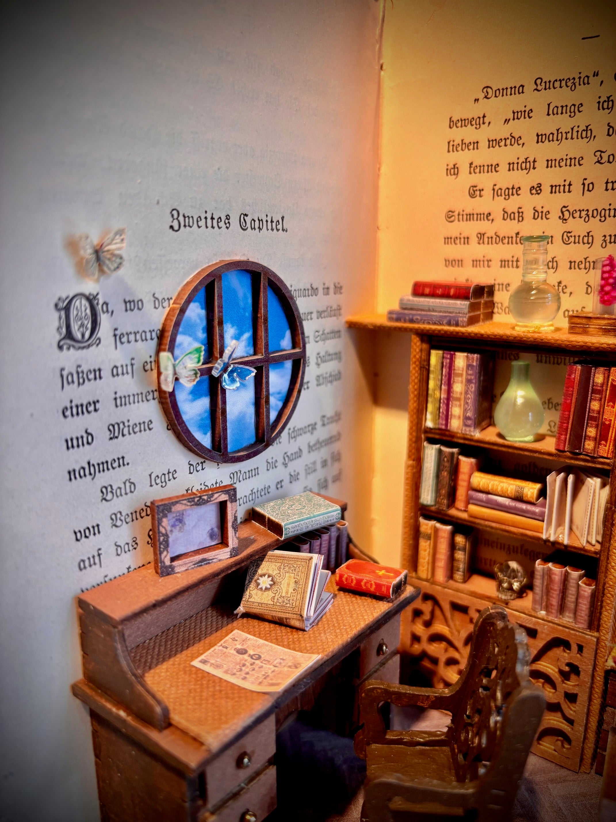 Buchszene mit Miniaturmöbel im Office-Stil mit Fensterluke und Schmetterlingen