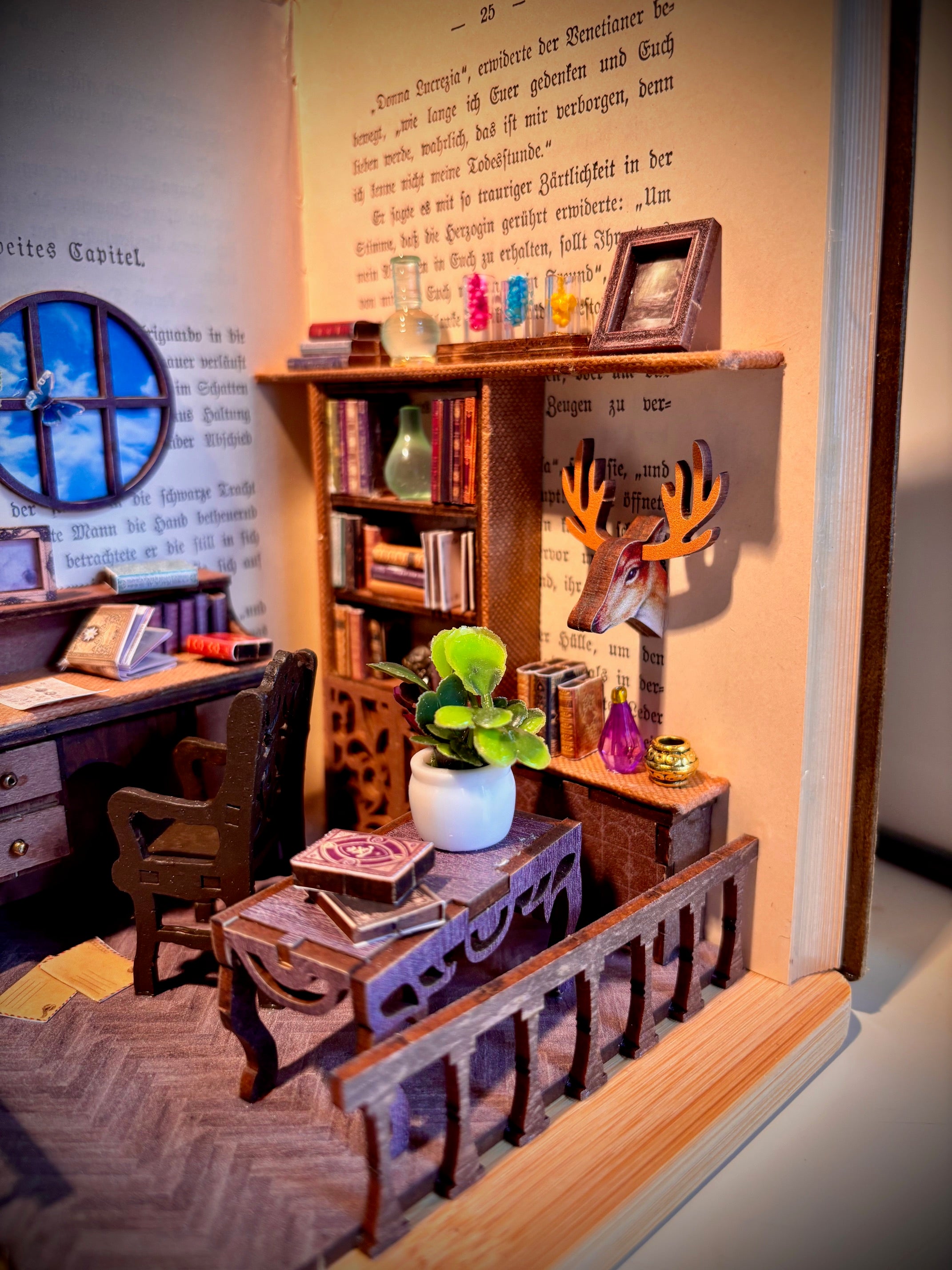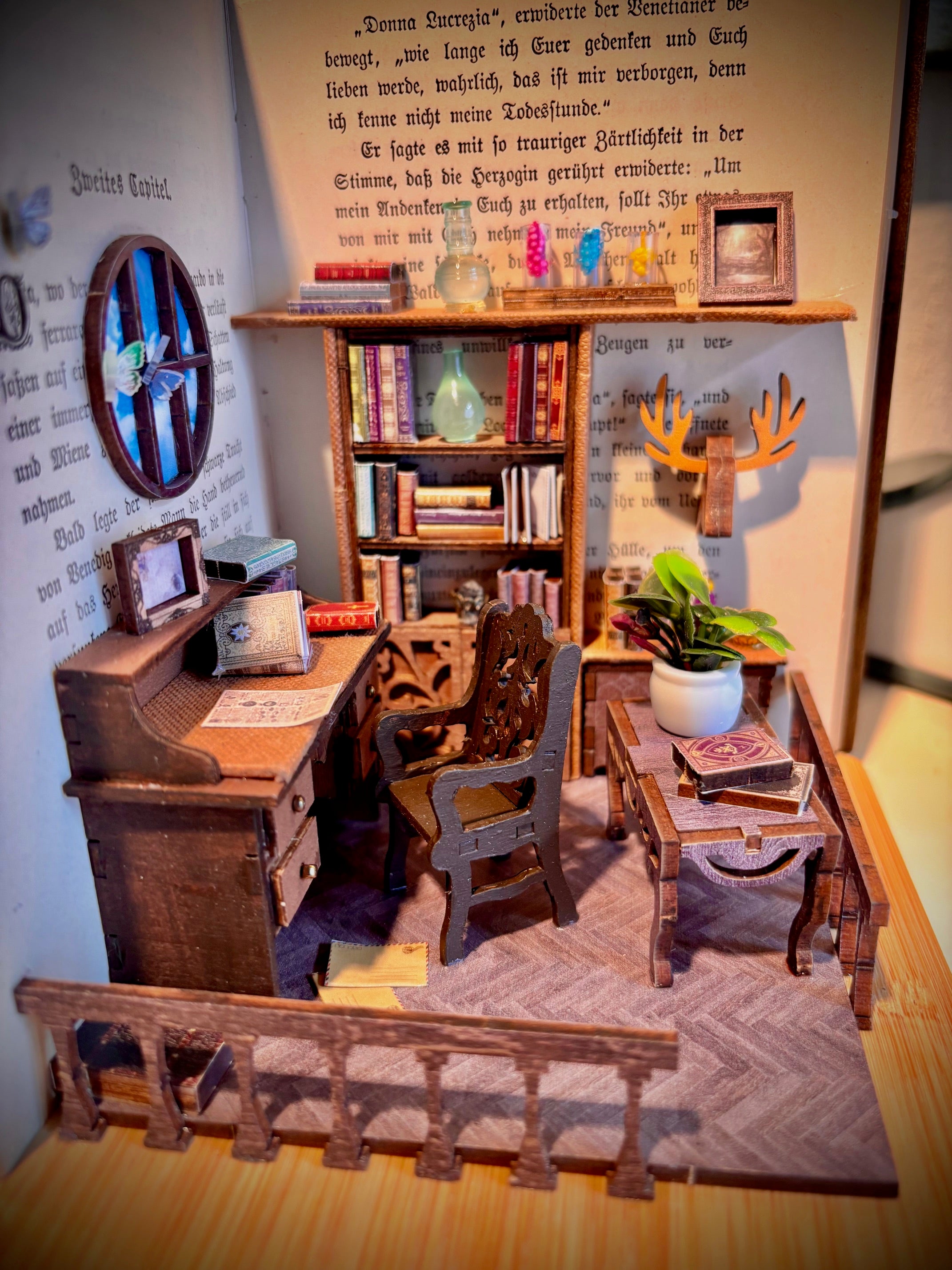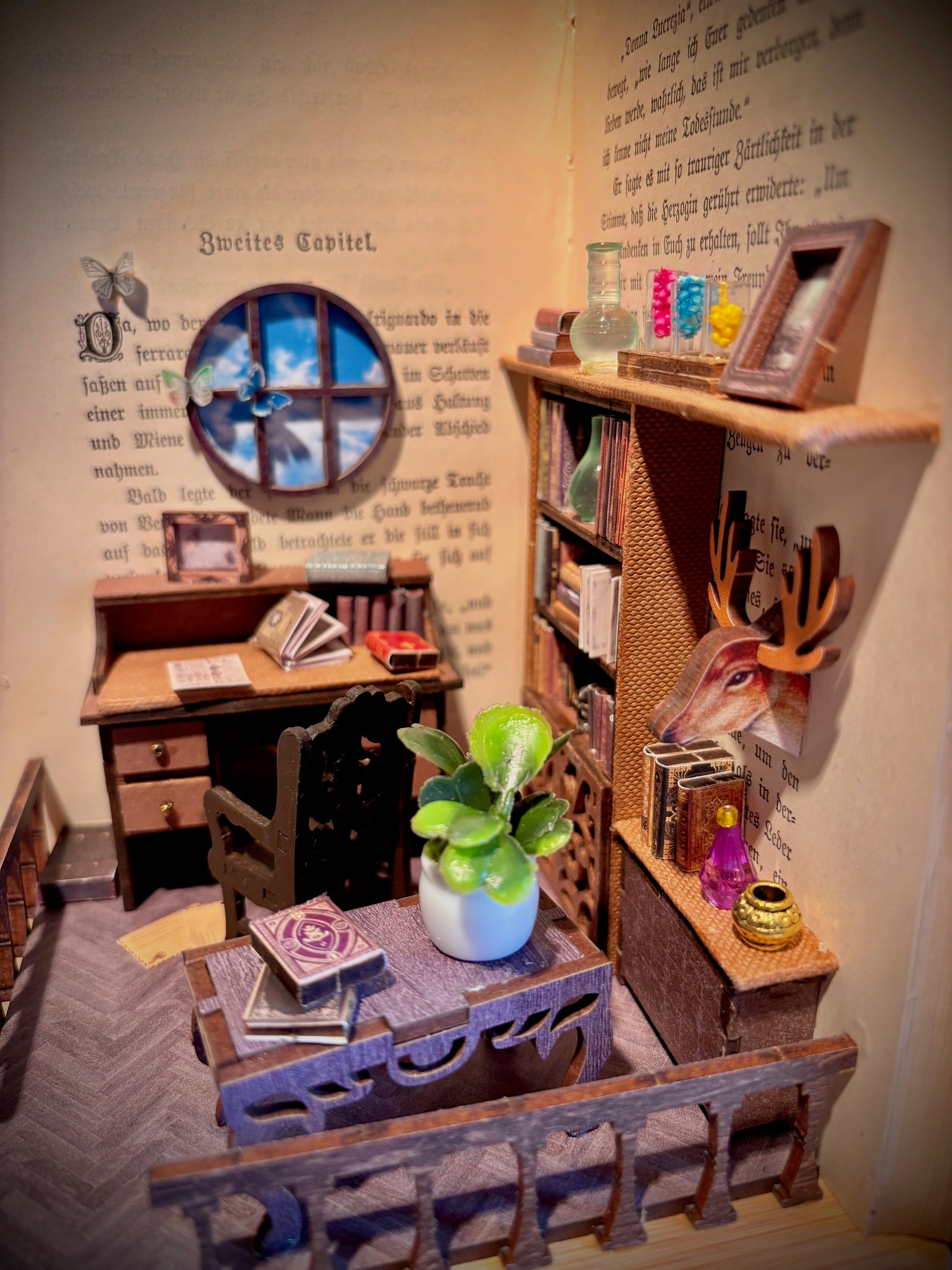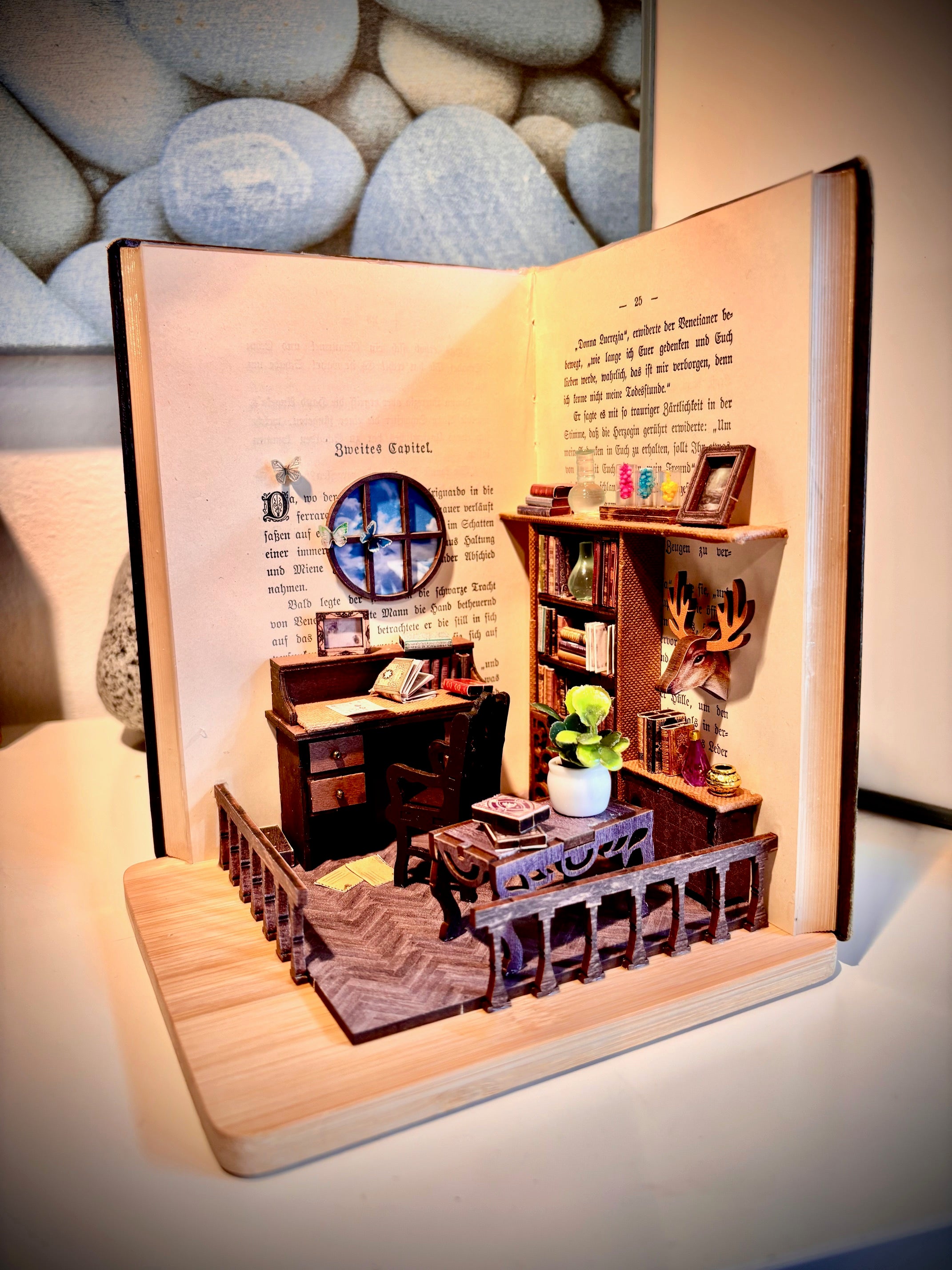 Buchszene mit Miniaturmöbel im Office-Stil mit Fensterluke und Schmetterlingen