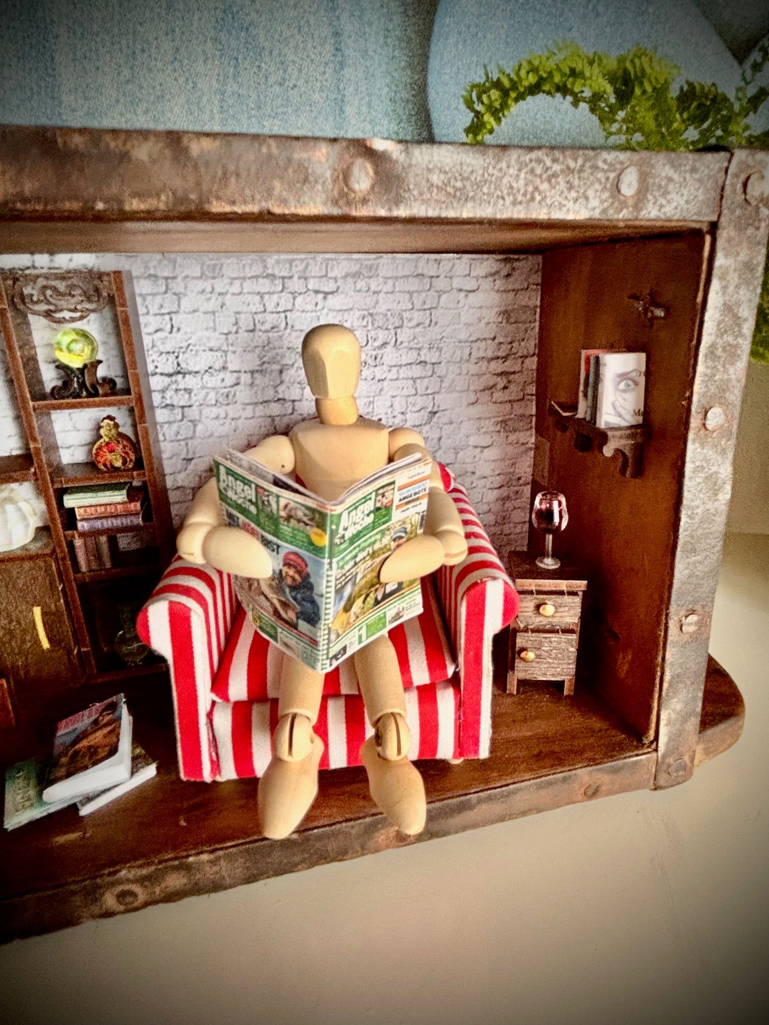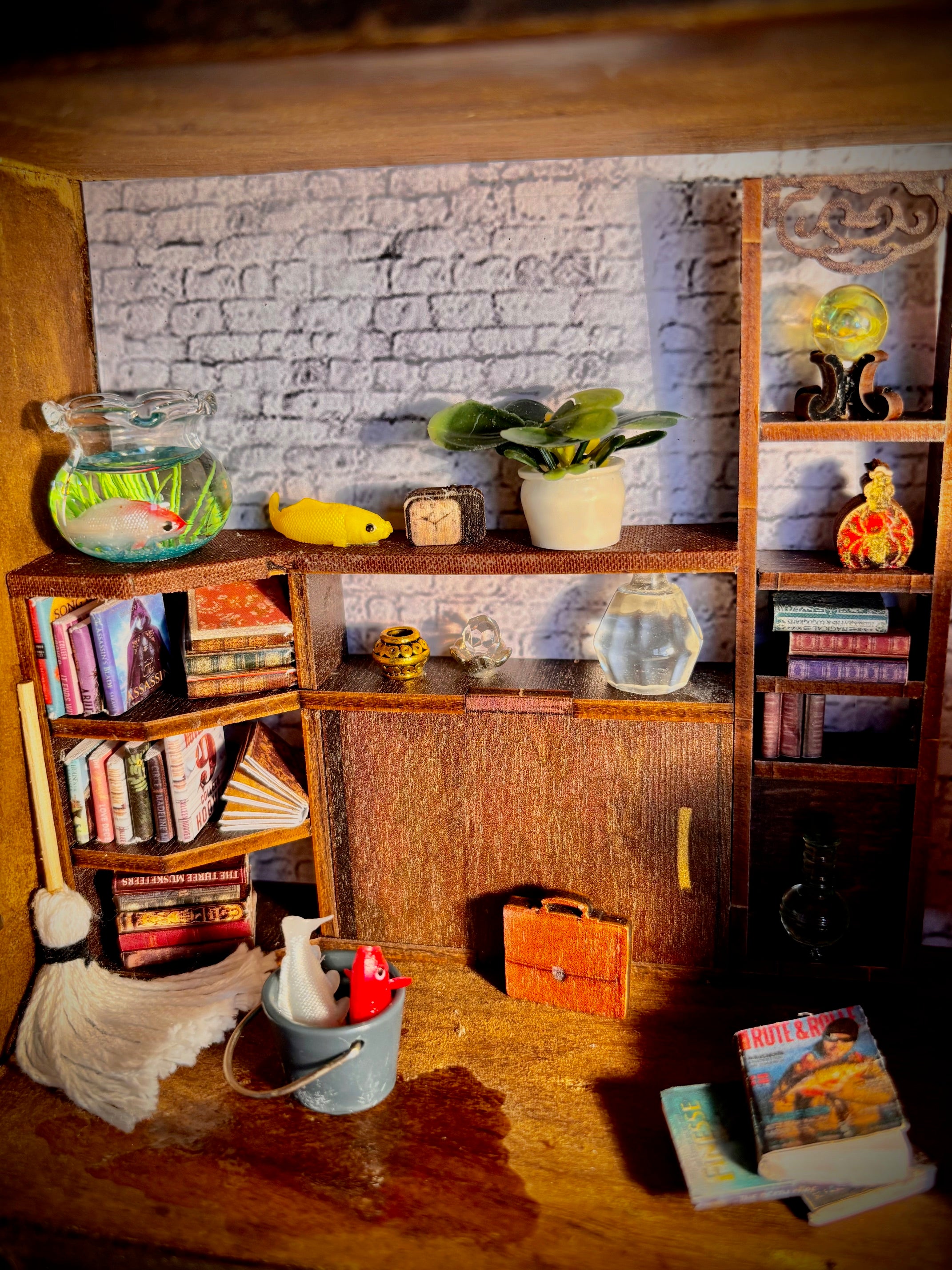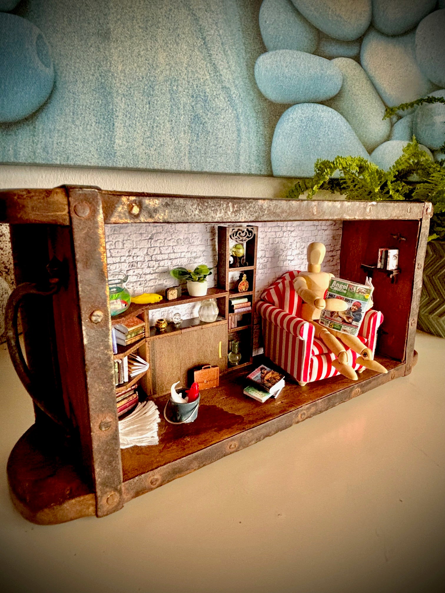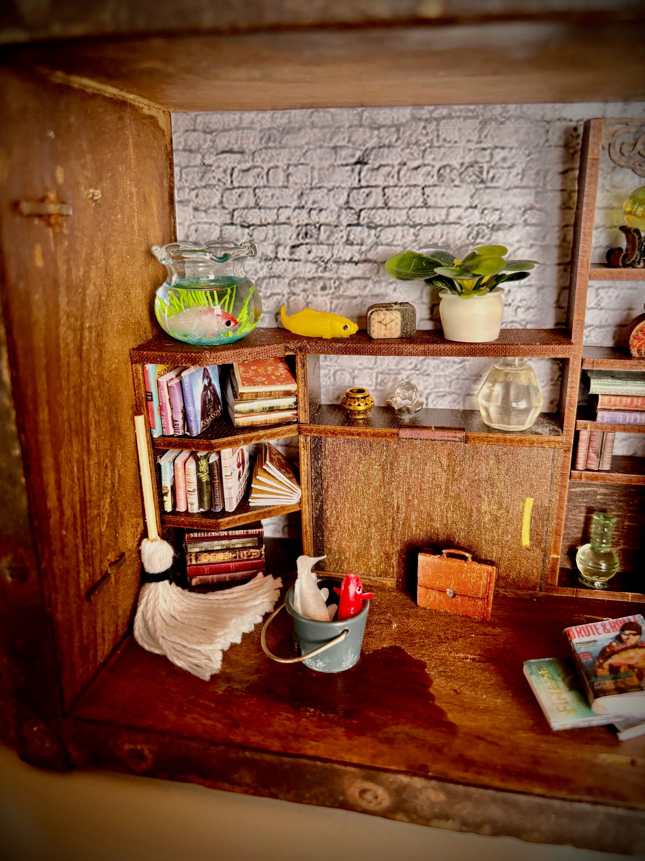 Szene in einer Backstein Holzform mit diversen Kleinartikeln