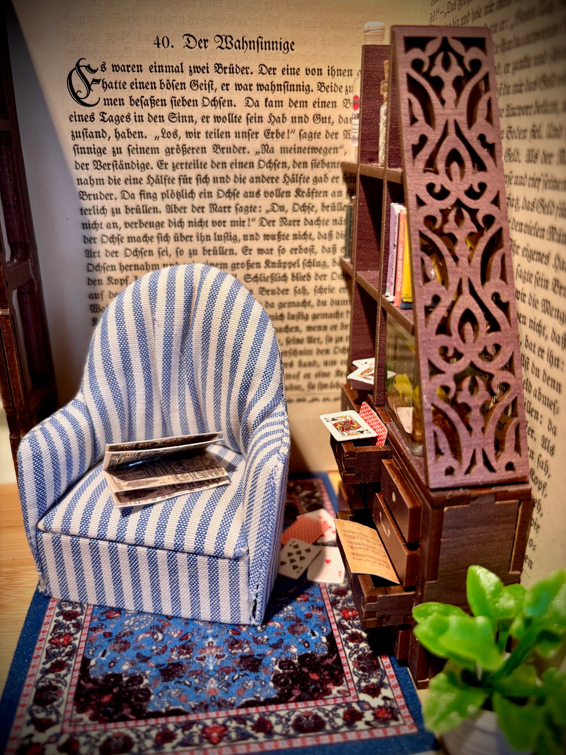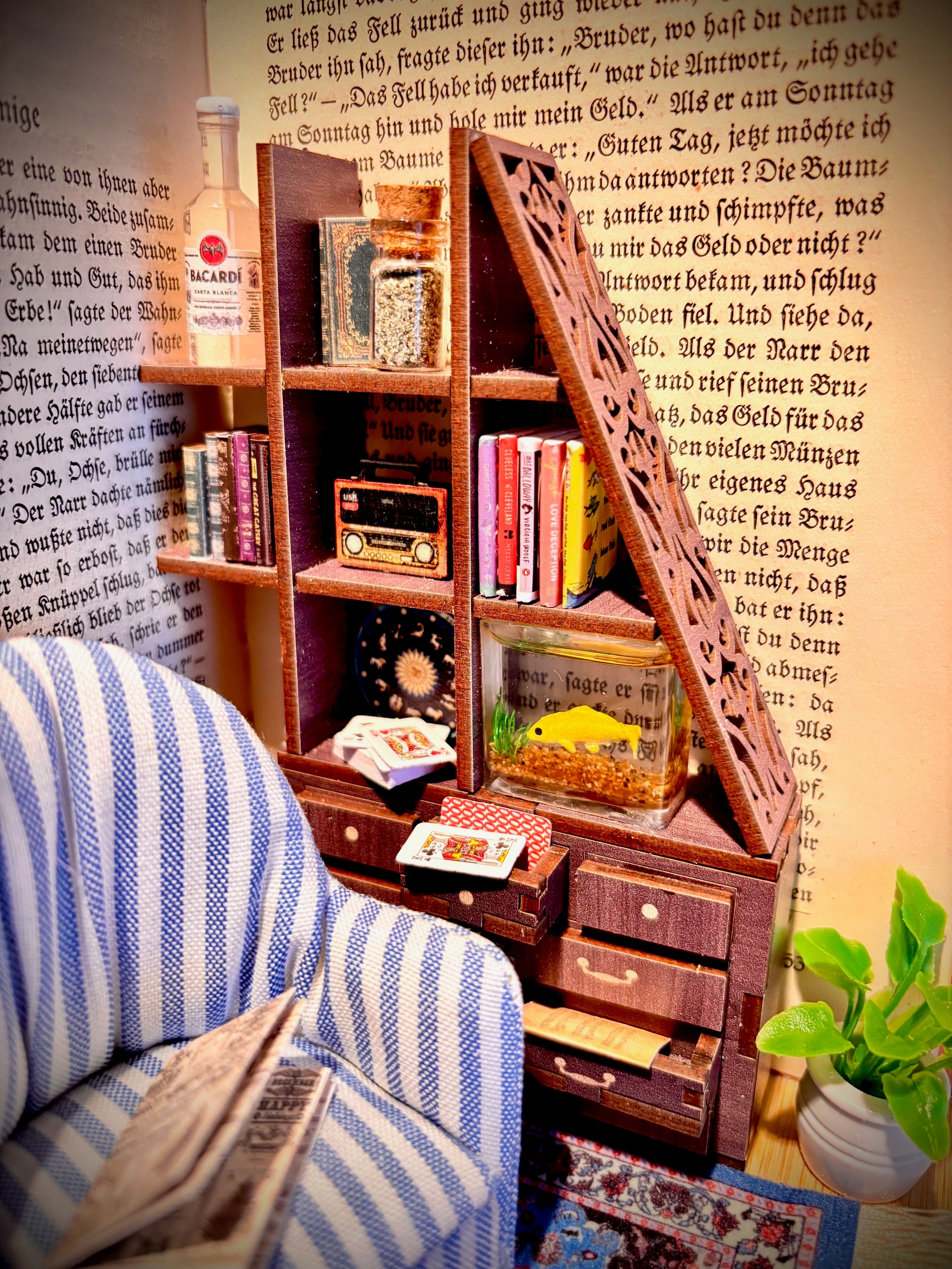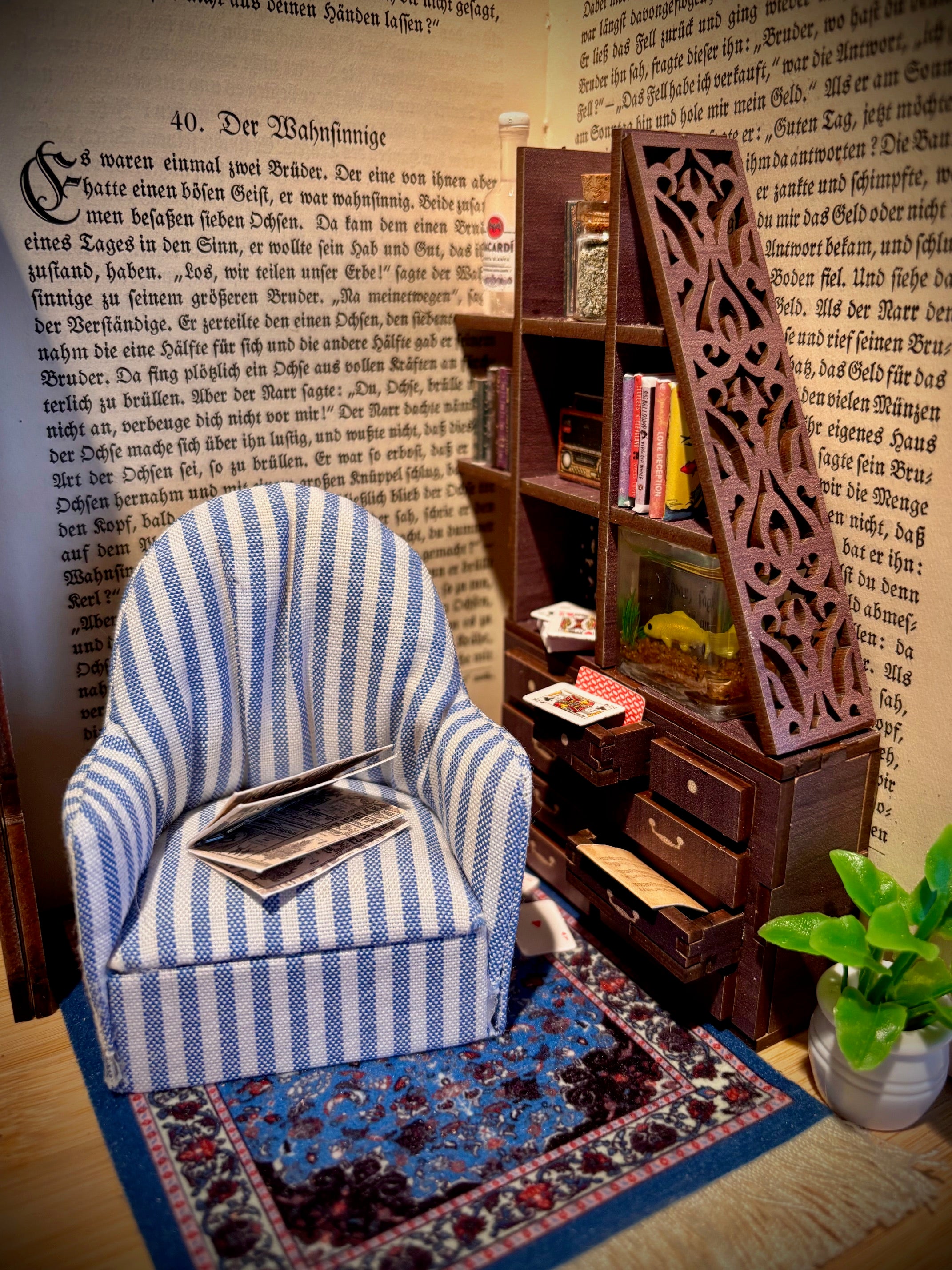 Buchszene mit Miniaturmöbel und Aquarium im Kapitel "der Wahnsinnige"