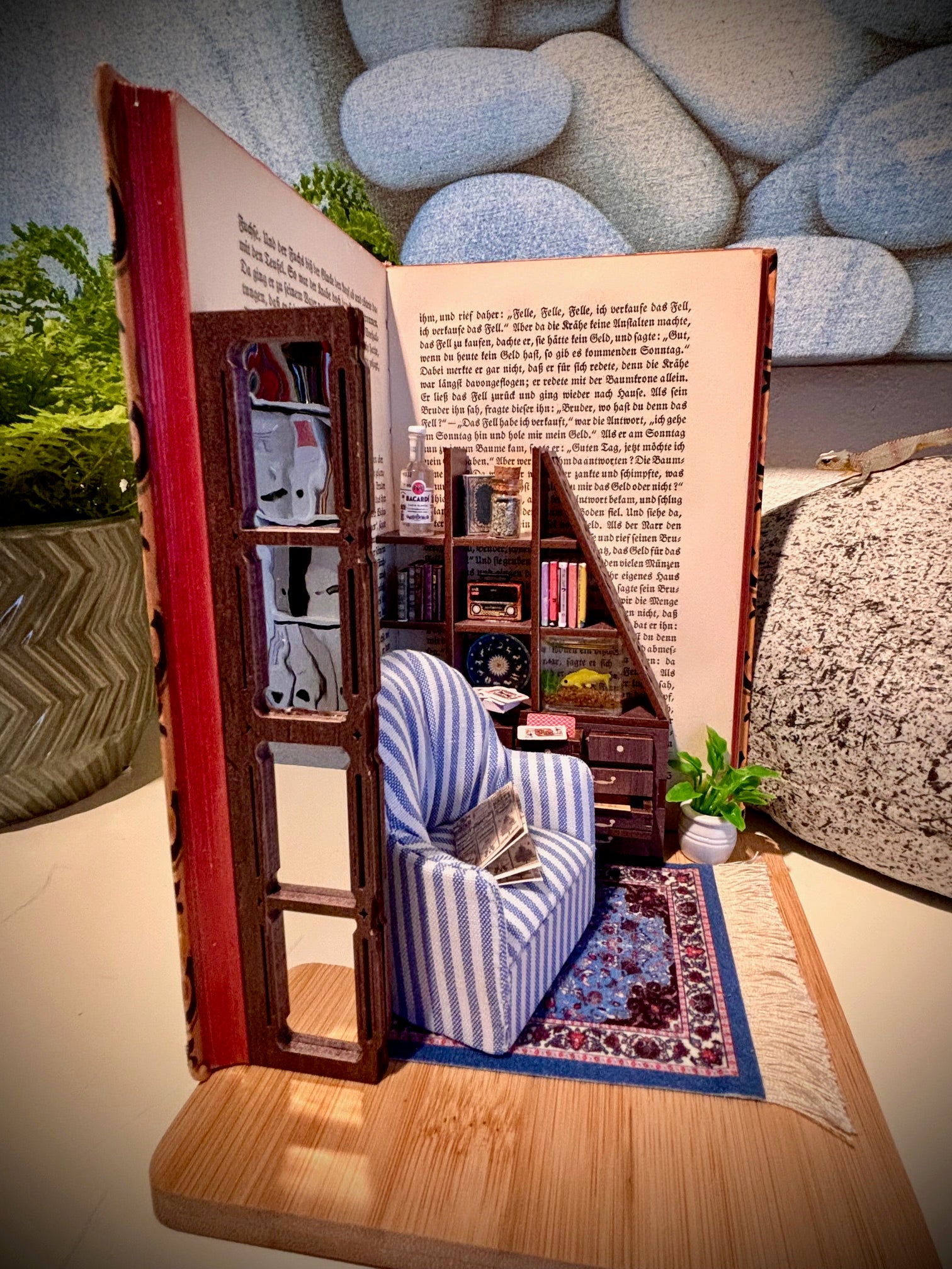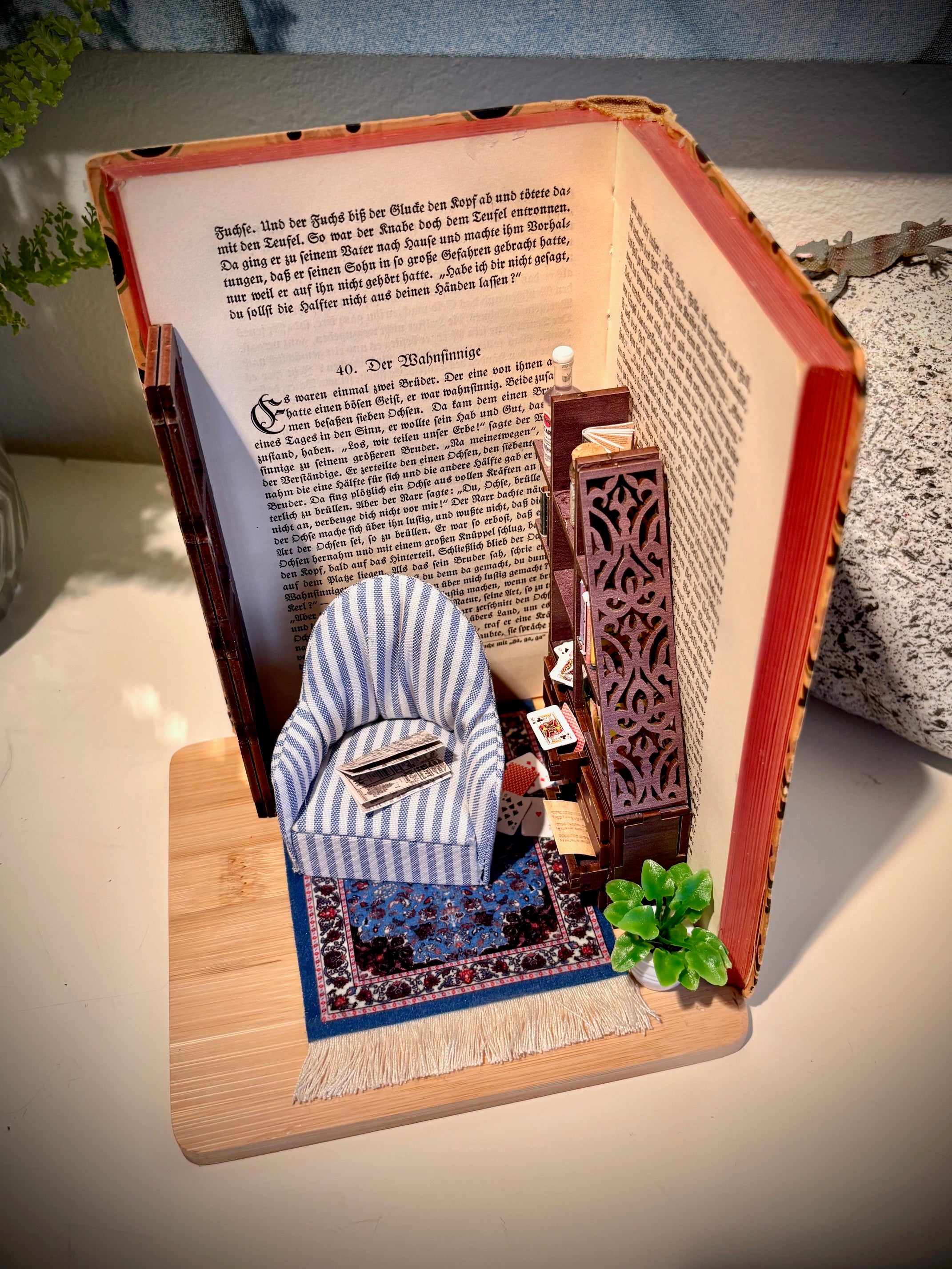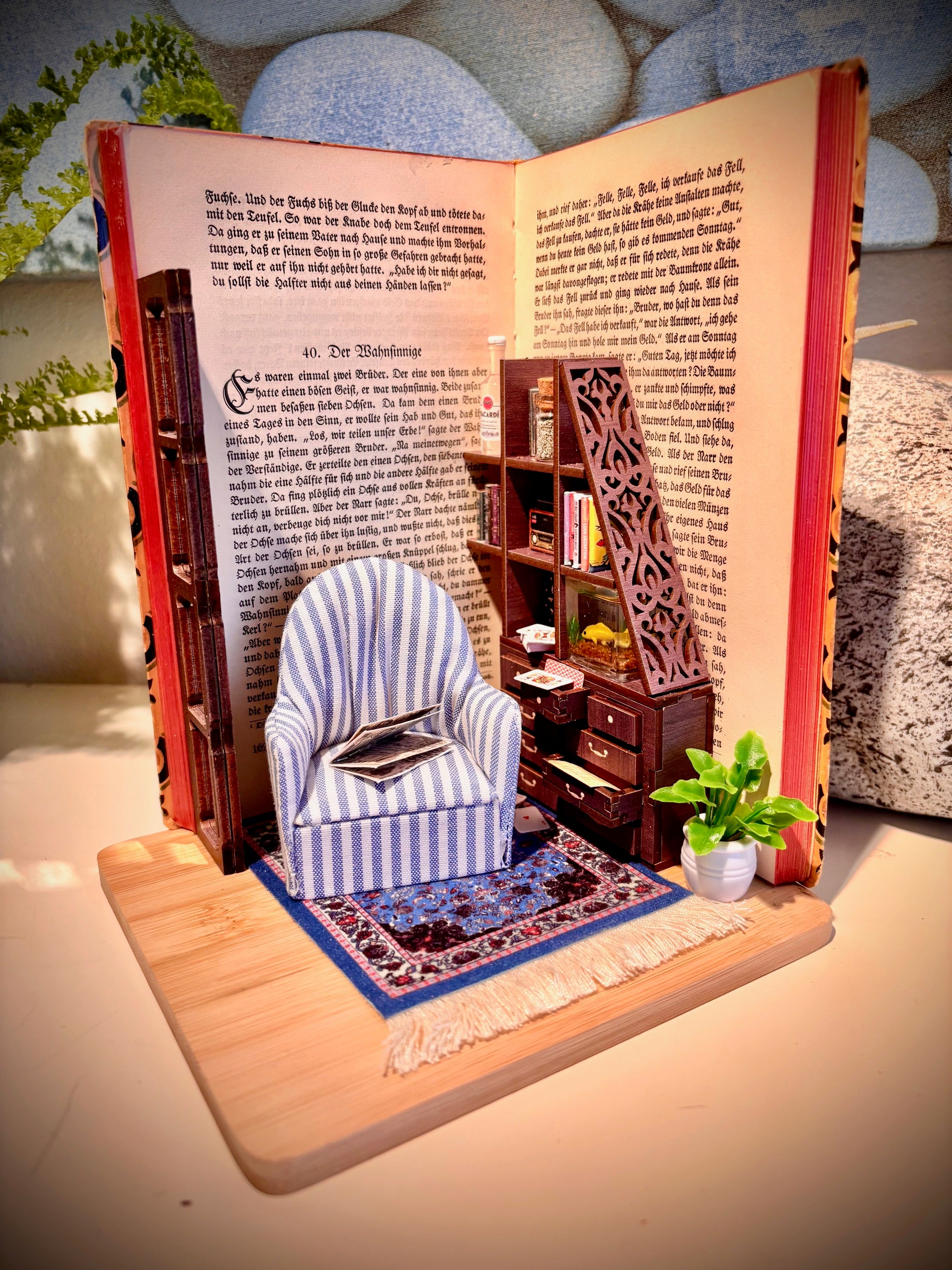 Buchszene mit Miniaturmöbel und Aquarium im Kapitel "der Wahnsinnige"